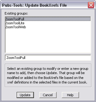 This command allows you to update an existing BookXRefs file based on the xrefs defined in the selected file(s). You can update the values in an existing xref group or add a new xref group to the BookXRefs file. (For information on xref groups, see Generate BookXRefs File.)