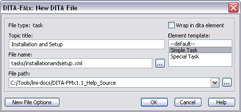 When you choose OK, the file is immediately saved as XML using the name specified. If you don’t provide a file name extension for the new topic file, one is added based on the type specified in the Default File Type option in the Options dialog. DITA map files are given the extension of “ditamap.”