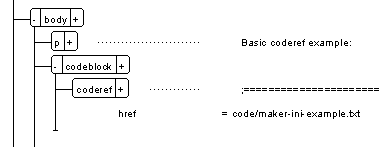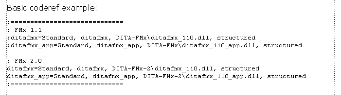 A coderef is basically a conref to a non-DITA file. If your documentation contains code samples, you can use a coderef to include code samples from the actual code files rather than copying and pasting that content into your document. This allows you to include real, working (and tested) code samples in your documentation rather than running the risk of accidentally modifying that code making it invalid.