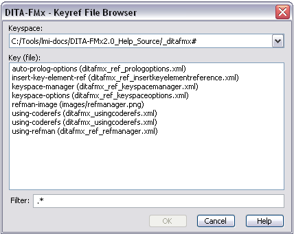 By default, when selecting a key reference for a coderef, the Keyref File Browser displays keys that reference all file types. If you want to browse for specific file types, edit the Filter field in the dialog. This field can be set to a space delimited list of one or more file extensions (no wild cards), such as “.txt .java .js”.