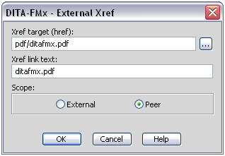 Choose the External Xref button in the Reference Manager dialog to insert an xref or link that references files outside of the documentation set. Specify the target (the href attribute value) and the link text (the content of the xref or link element), as well as the value for the scope attribute (“external” or “peer”).
