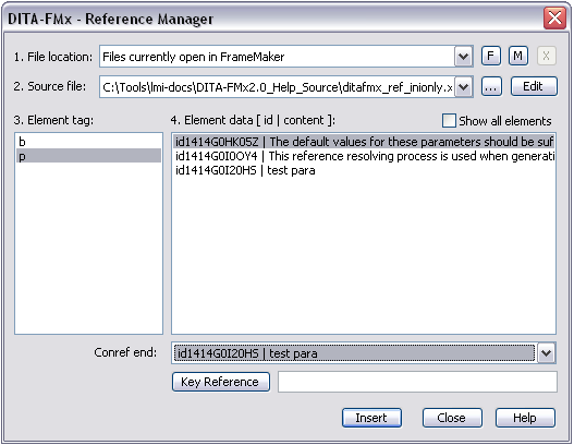 By default the Element Tag list displays only elements that have id attribute values in the source file. For conrefs, this list is further restricted by displaying only elements that are valid at the current insertion point. If you want to limit the xref or link targets to a specific list of elements, use the XrefElements parameter in the ditafmx.ini file (for details, see INI-Only Settings). When you select an element tag name from the list, the available target elements display in the Element Data list. By default, only elements that have an ‘id’ value are available, but if you select the Show All Elements option, you will be able to select from all available elements of the selected type (this option is only available if the “Files Currently Open in FrameMaker” file location is selected).