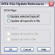 Depending on the type of file currently being edited, this dialog provides options for updating references in the file. If a DITA map is active, you have the option to update the selected topicref or all topicrefs in the file. If a DITA topic file is active, you can update xrefs, links, and/or conrefs.